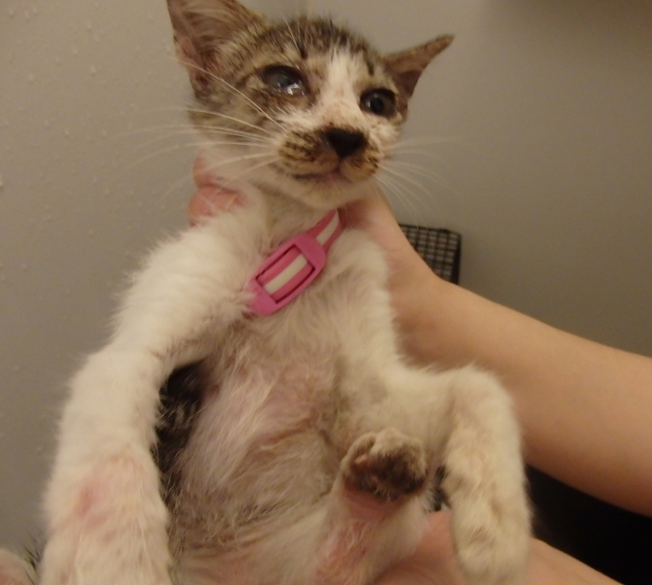 捕獲した時に気付いたのですが、子猫はプラスチック製のノミ取り用首輪を付けていました。