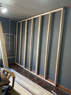 まずは角材で枠を作り、それを壁に触れないように床と天井に金具で突っ張って固定し、グラスウールを詰め込んで石膏ボードで蓋をする作業です。