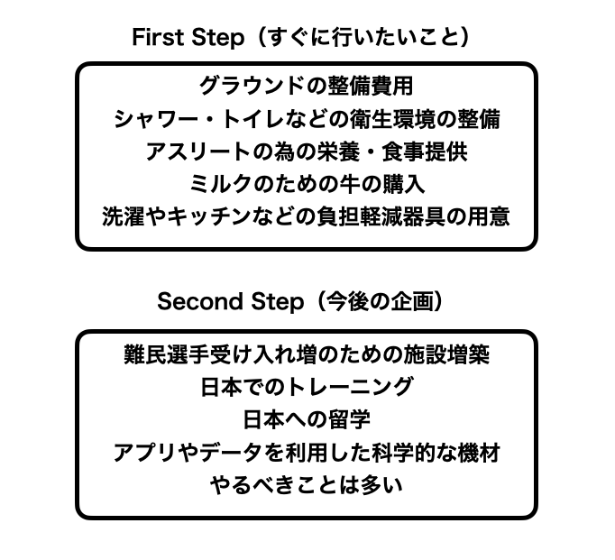First Stepとしてまずは現施設の練習環境の整備から行ってゆきます。 ・グラウンドの整備費用(現在はロードを走ることが多く、練習に集中できる環境作り) 約120万円 ・シャワー、トイレなどの衛生環境の整備(メンタル面での負担の軽減へ) 約70万円 ・栄養管理や、タンパク質などの食事の提供・1年分(現在は練習後にパンなど栄養に偏り) 約80万円 ・渡航費、現地生活費 約30万円 ・その他(手数料など)