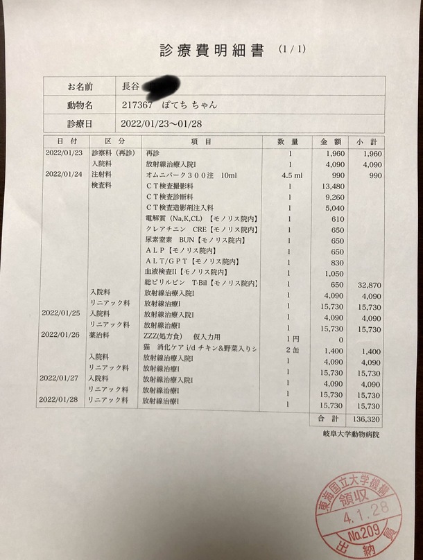 1月23日(日)から本日1月28日(土)まで岐阜大動物病院に入院して不足分の放射線治療を受けてきました。