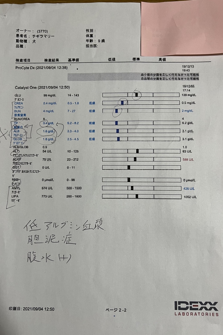 血液検査、超音波検査で診てもらい、腹水が溜まっており、腸の幅?がおかしいと言われました。
