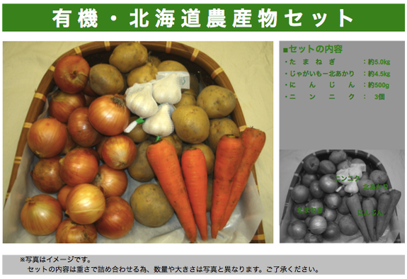 北海道産野菜 NPO法人あぐり・びれっじのジャガイモ、玉ねぎ、人参、カボチャなど有機野菜を予定しています。発送時の状況により変更もあることをご了承ください。