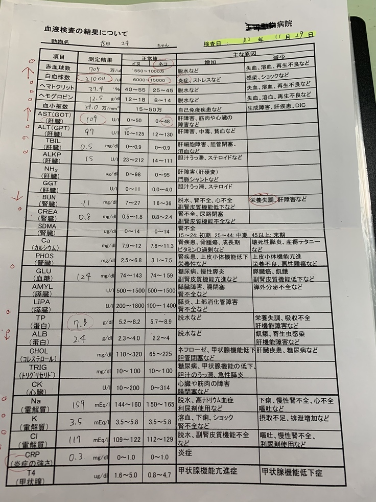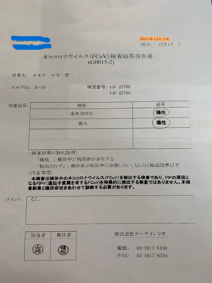 すぐに血液検査とエコー検査をし 腹水が溜まっているので 腹水を抜いて FIPの可能性があり