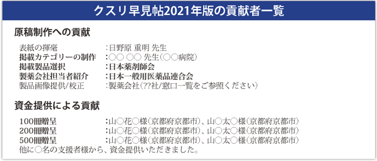 3万円以上のリターンでは、『クスリ早見帖2022年版』の貢献者一覧にお名前を記載させていただきます。下記のような体裁での掲載を予定しております。