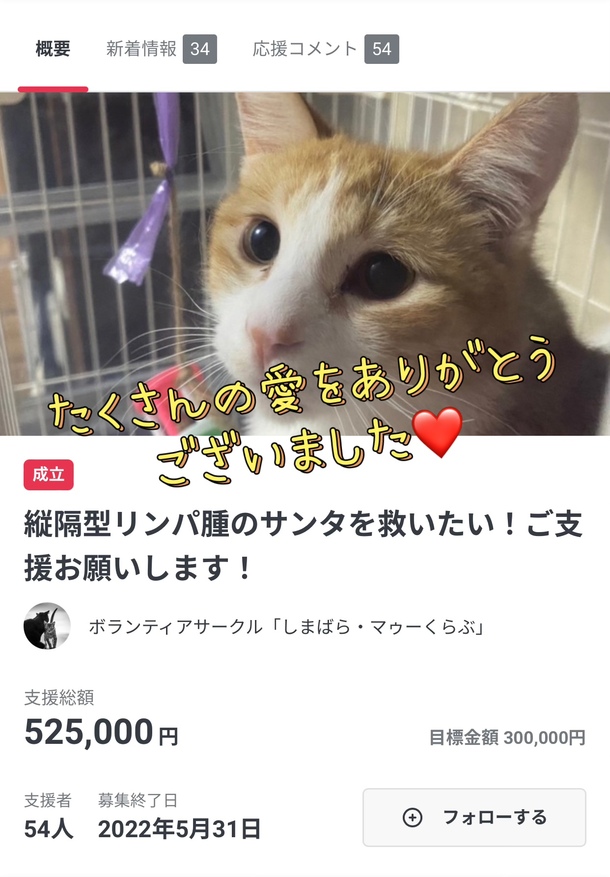 5月2日よりスタートしましたリンパ腫と闘病している保護猫サンタのクラウドファンディングが終了致しました❣️