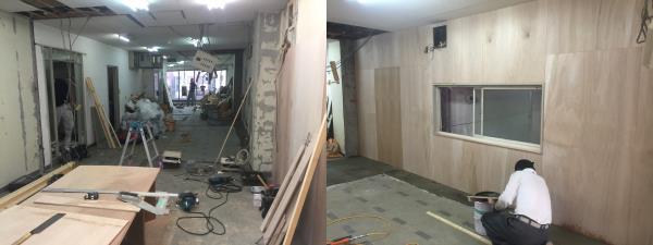 右:壁の撤去に伴い、床面をモルタルで埋めていきます。