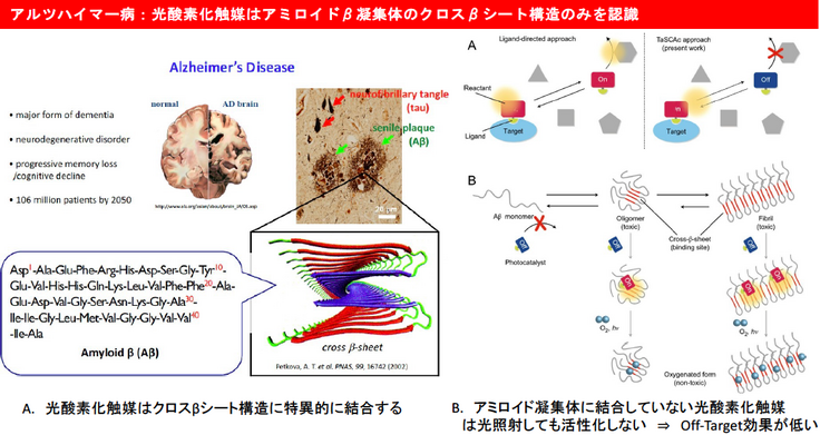しかし、現状では認知症治療の根本治療には有効な薬剤は存在しないために、画期的な治療方法の開発が望まれており、我々の光触媒化合物は将来の認知症、全身性アミロイドーシスを根本的に治療する薬剤になり得ると考えております。