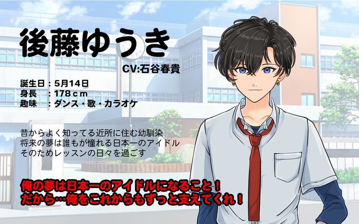 「俺ゆうき。高校3年生。趣味はダンスと歌。よくカラオケに行ったりするよ。よろしくな。」「なぁ、今度の休日はオフだから買い物行かね?」