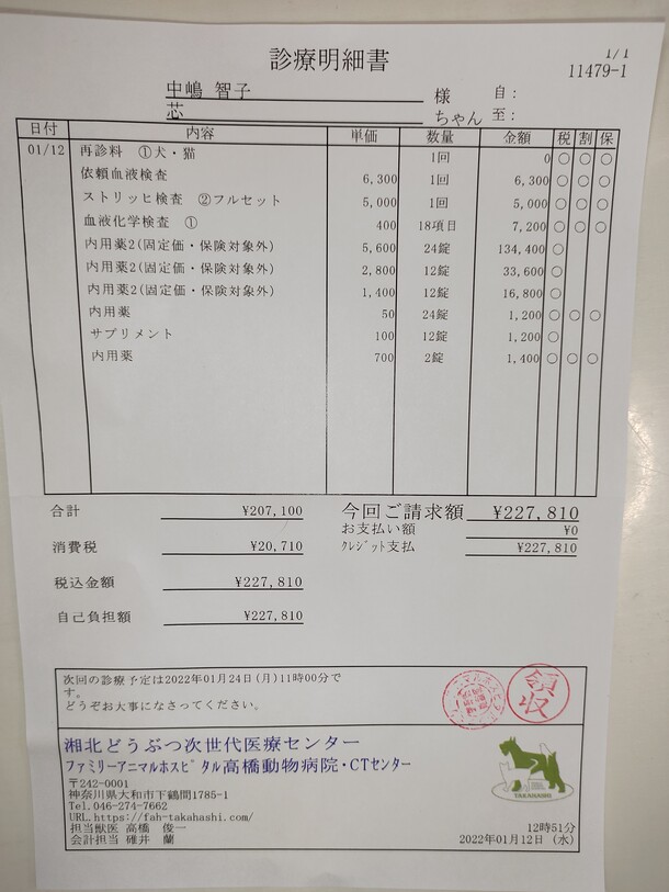 次回は、更に増えるでしょうし、血液検査の他にエコーや、X線の検査もあるので、 “30万円" は覚悟しないといけません‥‥😱