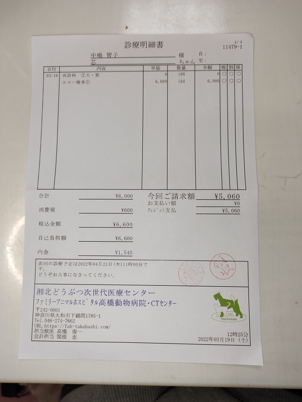 本日のお会計は、今回は、血液や、外注依頼や、レントゲンが無かったので、