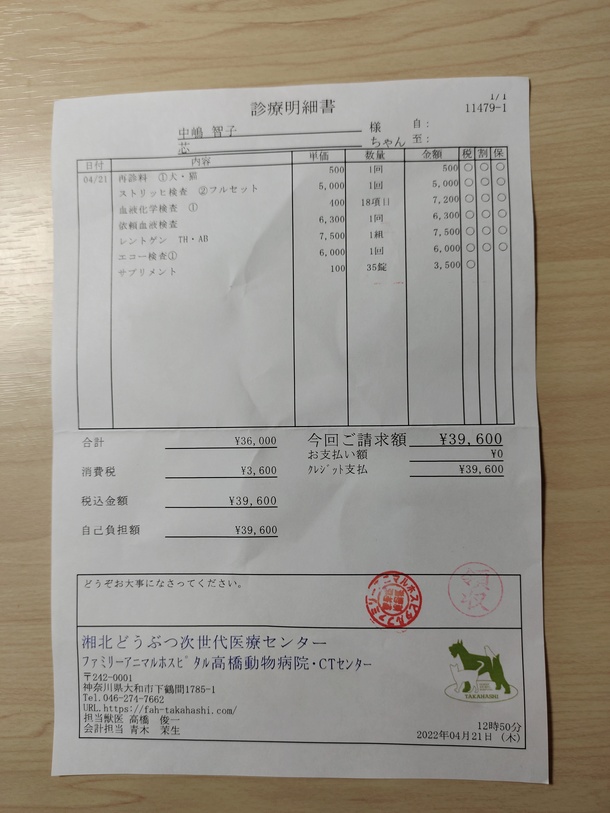 今回の検診のお会計は、39600円で想像していた料金より、4000円低く助かりましたが、今まで芯に掛かった費用は、トータルで約200万円となりました😔💦。