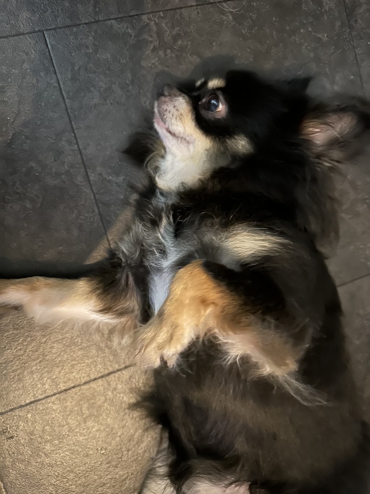 目が合った瞬間撫でてもらうために床にゴロンして待ってる様子です。