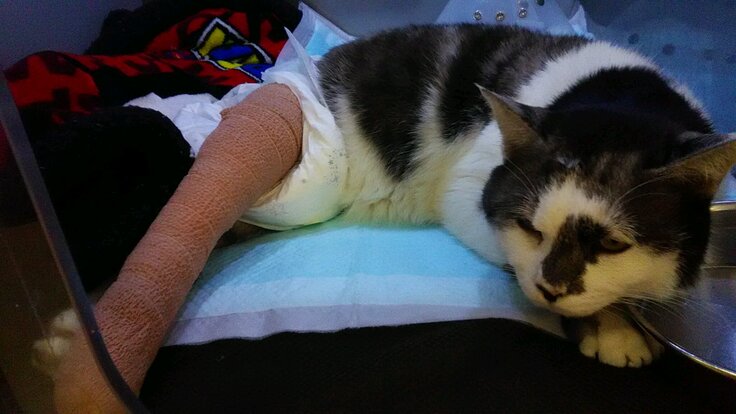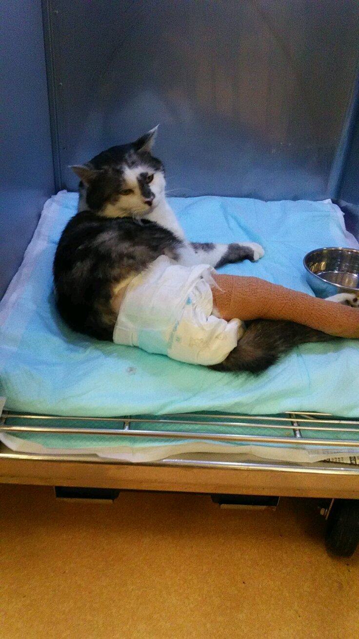 退院日はまだ未定ですが、退院後2か月は骨を固定させるためケージから出さないようにし、その後リハビリさせるようです。