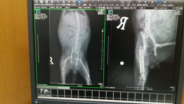 これから2か月間はケージの中での生活です。その後プレート除去の手術が必要だろうと言われています。骨盤などの他の損傷は様子をみながらとなります。