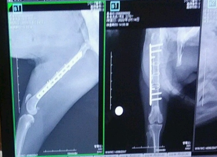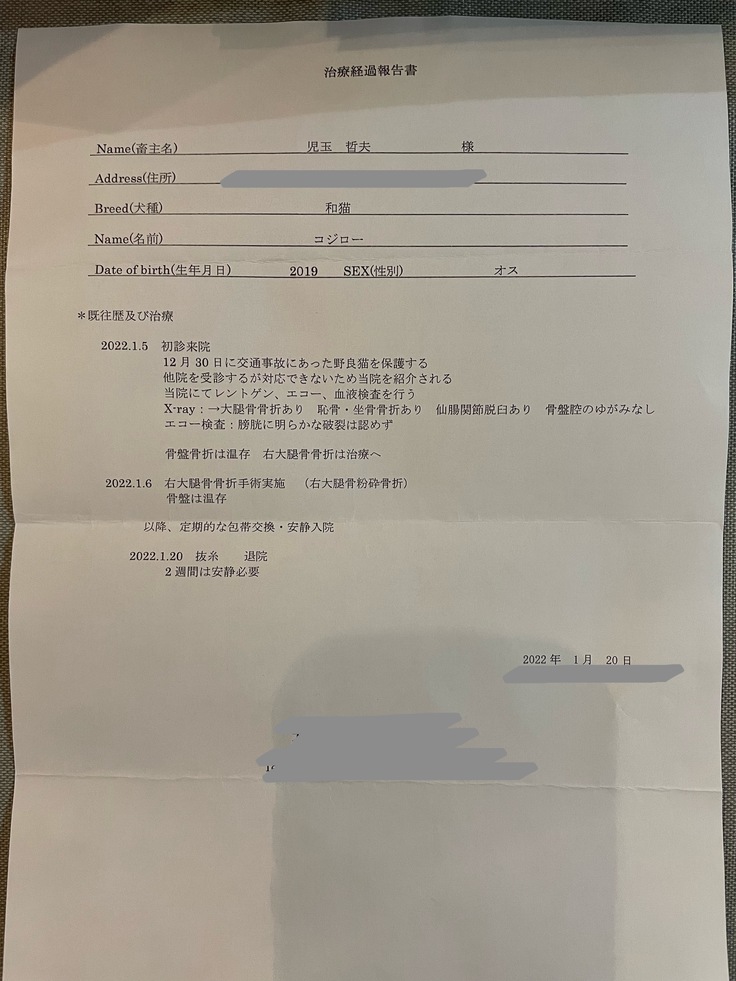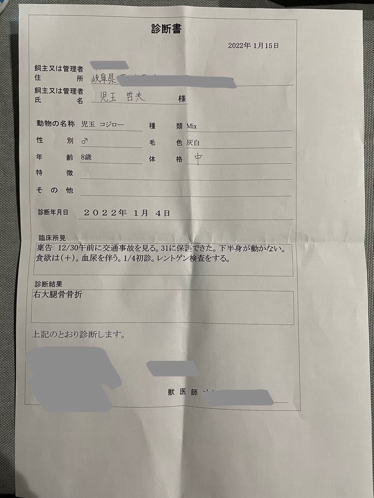 近くの動物病院で診察していただいたところ、大腿骨の骨折で手術が必要とのことでした。