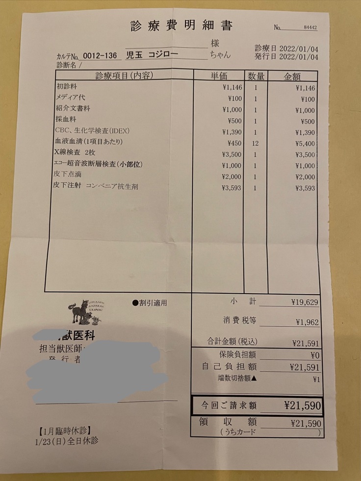 最初に診察していただいた病院ではその手術はできないとのことで、愛知県犬山市にある動物病院へ紹介状を書いていただきました。