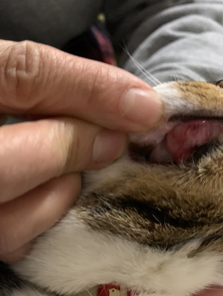 右上顎全体と、特に右上顎犬歯あたりに真っ赤に腫れを発見。