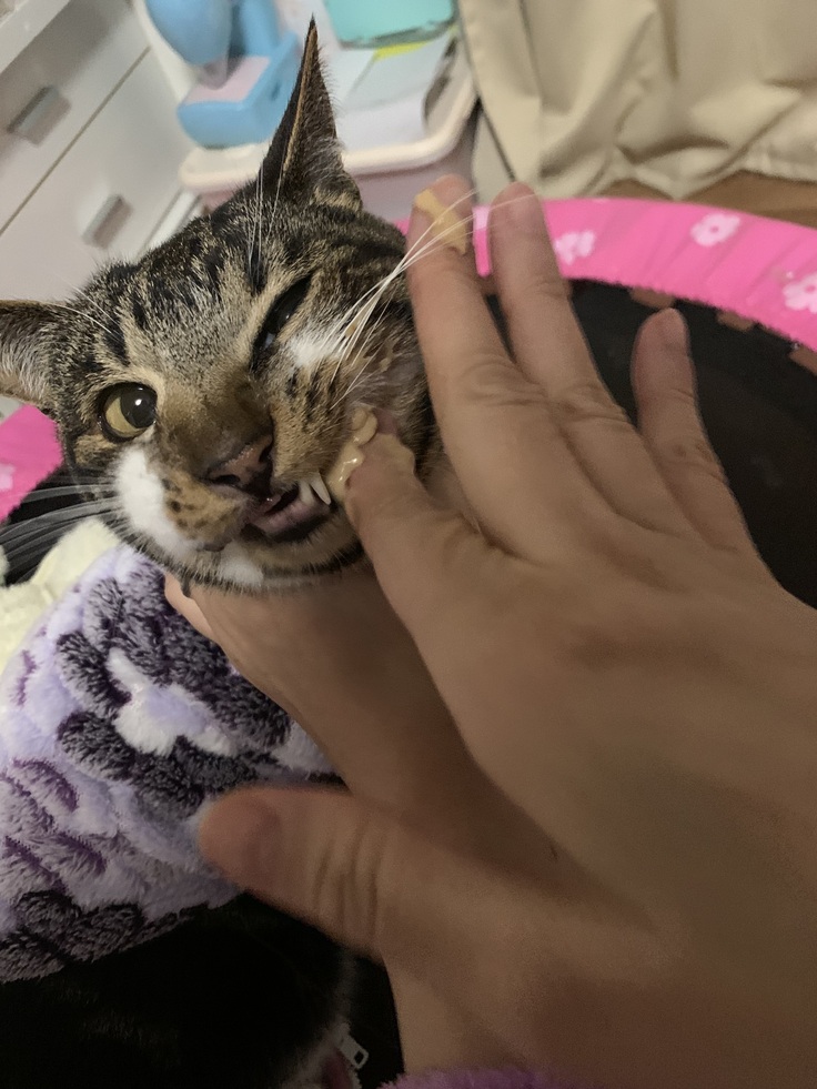 一人では食べれない為に腫瘍がないほうの左側から口に指で入れたり、シリンジを使って給餌しています。