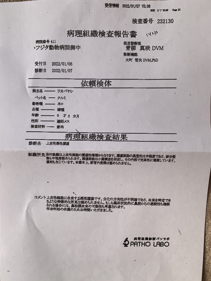 まだ9歳ですが、口腔内の上顎にできた悪性腫瘍【上皮性悪性腫瘍】の為
