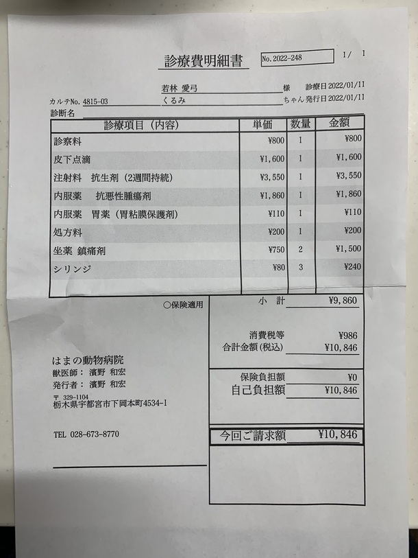 皮下点滴、抗生剤、パラディア、胃薬、坐薬の処方をしてもらってきました。