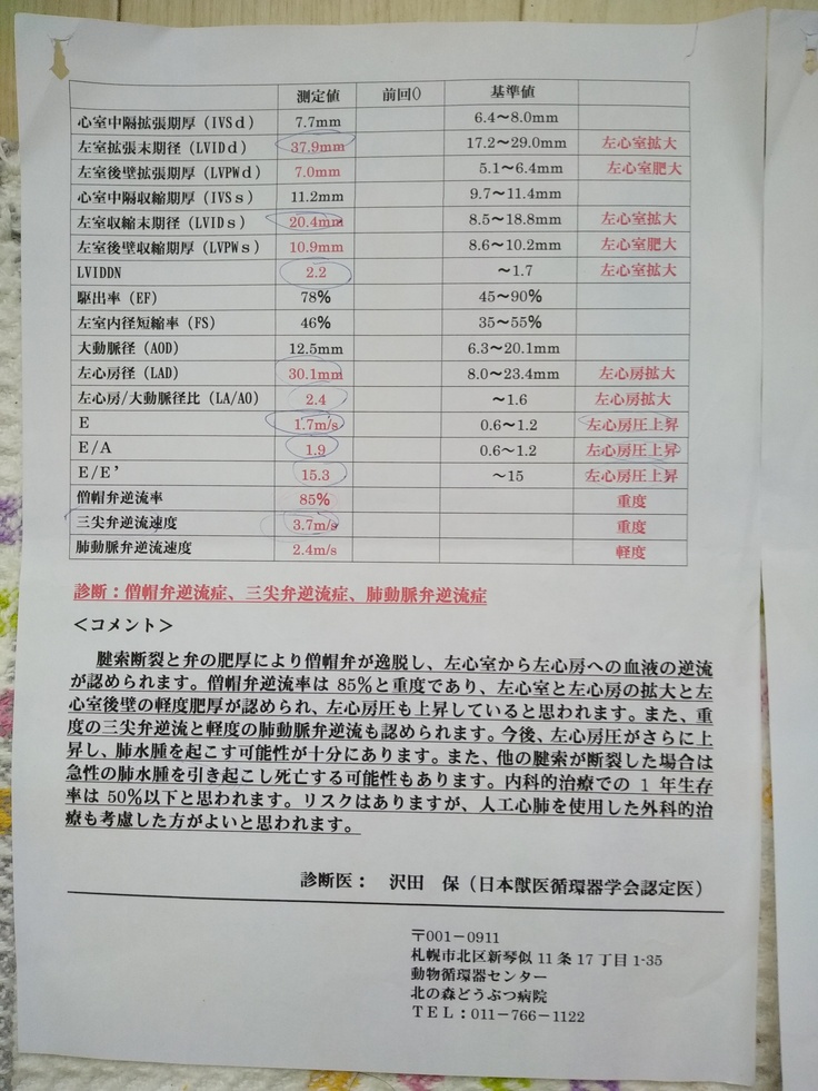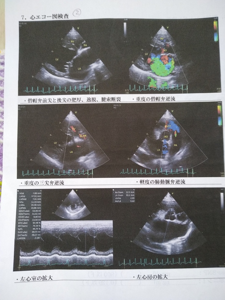 12月に急に咳き込む事が度々あり行き付けの病院を受診したところ心臓の専門病院で検査を受けることになり、一日がかりの検査の結果僧帽弁閉鎖不全症と診断されました。その時点でかなり重症な状態だと説明されました。三尖弁逆流もありました。