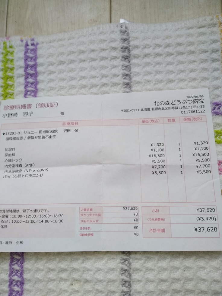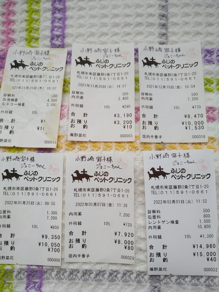 ジヨニーは今迄暮らしてきた犬達とは全く違うし、おもちゃを食べてしまい何度か病院にかかり何が起きるか分からないと思っていたので50%補償の保険に入っています。ですが通院も検査代も上限があるためほんの僅かの補填にしかなりません。検査費用薬等の領収書