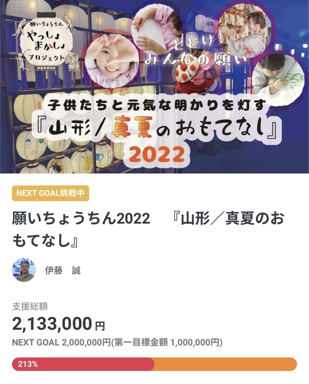 本日6月15日にネクストゴールの200万円まで来ることができました。これまでご支援いただいた皆様に対し厚く感謝申し上げます。