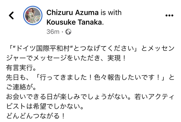 そのことを覚えてくださり、ドイツ国際平和村のスタッフと東ちづるさんが僕の活動をシェアしてくださり、メッセージも送ってくださいました。