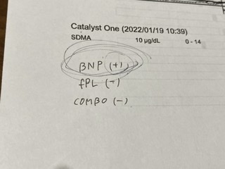 BNPというのに陽性反応が出ると心臓が悪いということだそうです。