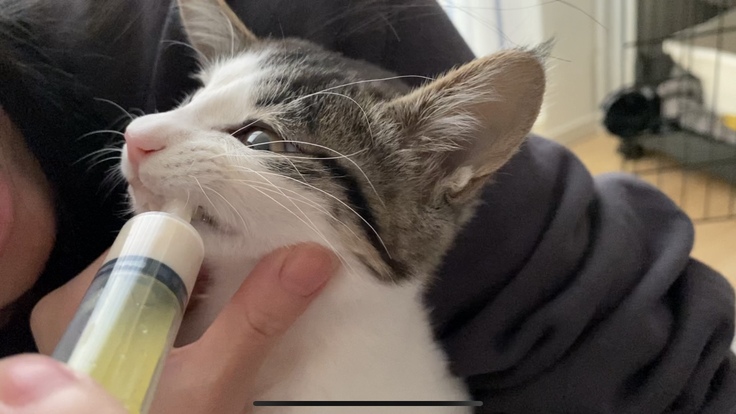 一つ目の変化は、つくねが自力で餌を食べられるように回復したため、現在は点滴、注射は行わず飲み薬タイプの強心薬を服用していることです。