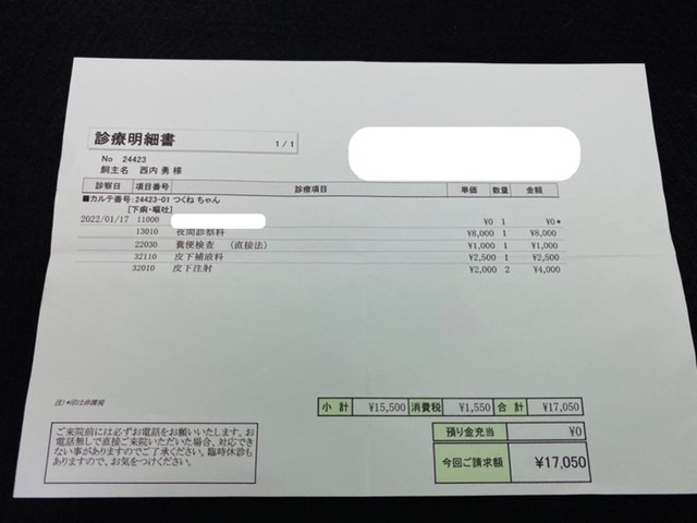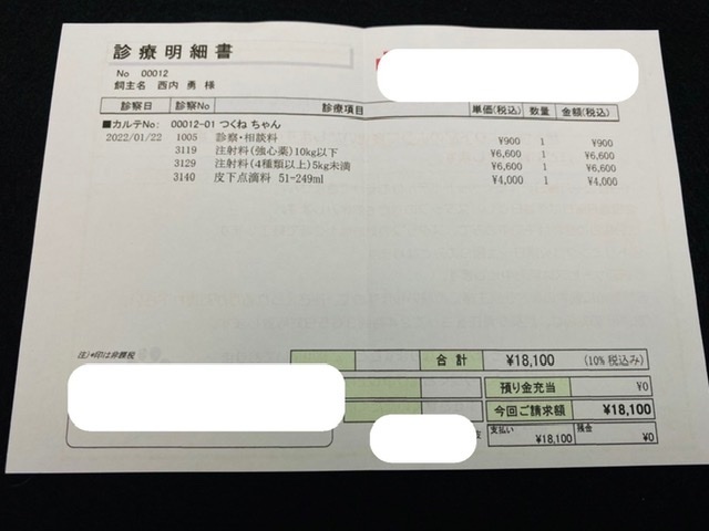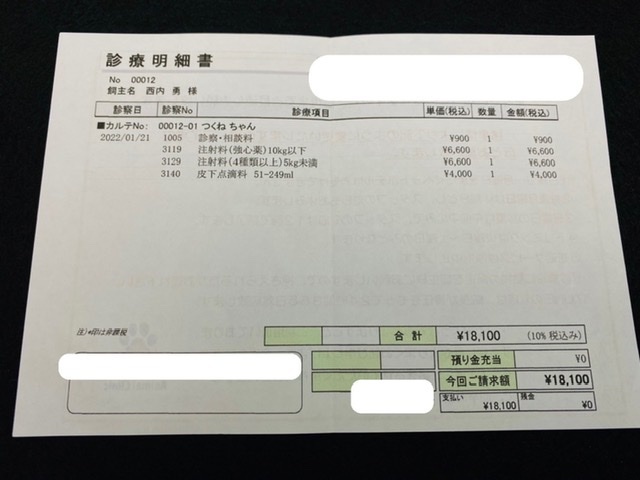 治療費(診察代込み)約18,100円/1日に加えて、血液検査等の費用が掛かるため