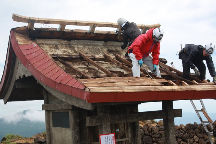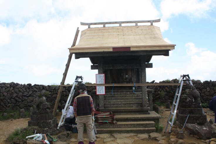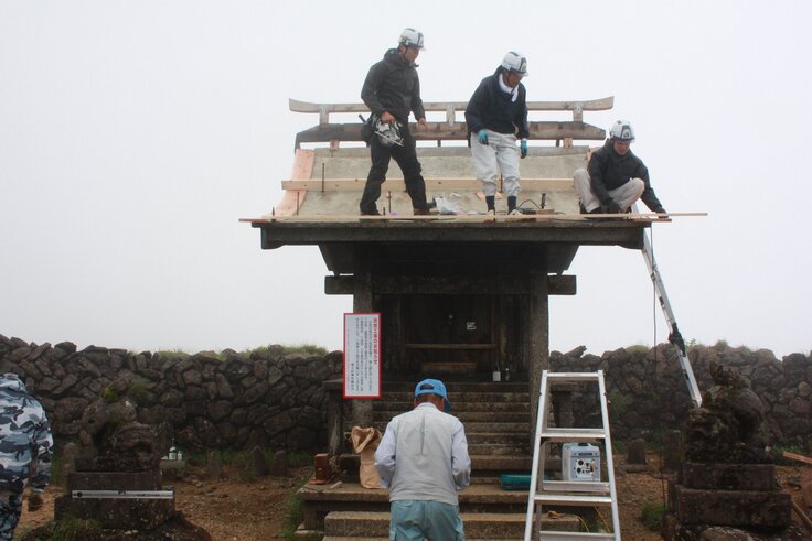この度の作業にあたり、片道50分の登山道(刈田駐車場から熊野岳山頂)を人力による資材運搬にご支援して下さった総代並びに山岳インストラクターの方々ほか多くの皆様、また山頂に泊まり込みで工事をしていただいた業者の方々(山形市・畠山工務店)には心より厚く御礼申し上げます。