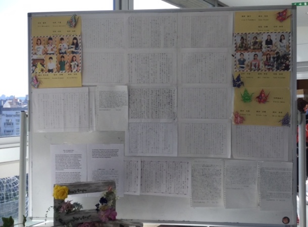 温かい雰囲気のなか、朗読会ではご参加くださった皆様が子ども達からのメッセージに真剣に耳を傾け また展示された原本や添えられた写真をご覧になり、こんなに可愛らしいく若い子どもたちが こんなにも素晴らしい文章を書くのかと非常に感心されておりました。制作会を行い、平和を皆で考えた後に書かれたものが多数だという経緯をお話すると、更に 素晴らしい取り組みだとおほめの言葉を頂戴し、今後も継続してくださいとお言葉を頂きました。