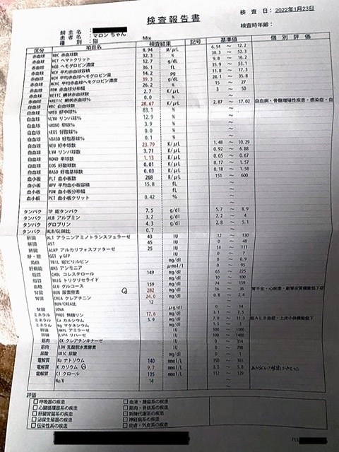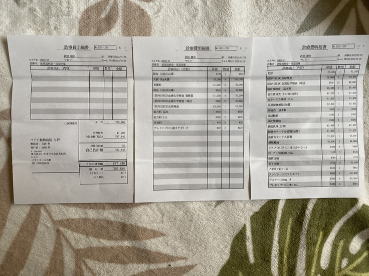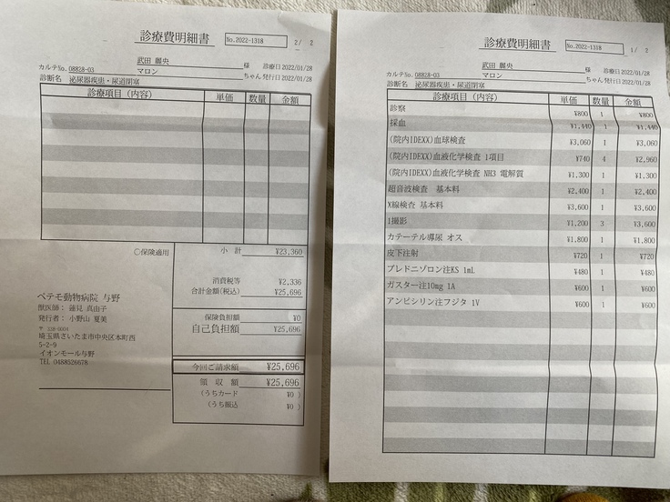 現在マロンは退院しておりますが、頻尿気味で、未だに尿を上手く出すことができておりません。その為、また尿が溜まってしまい腎不全を起こしたりや再度尿道閉塞を引き起こしてしまう可能性が高いです。 今後については、尿溜まりの確認を1週間に1回行う必要があります。1.28日に受けた診察内容を毎回行う必要があり、費用として2万5千円がかかることになります。その通院の中で、入院が必要になった場合は、2万円弱必要になってきます。
