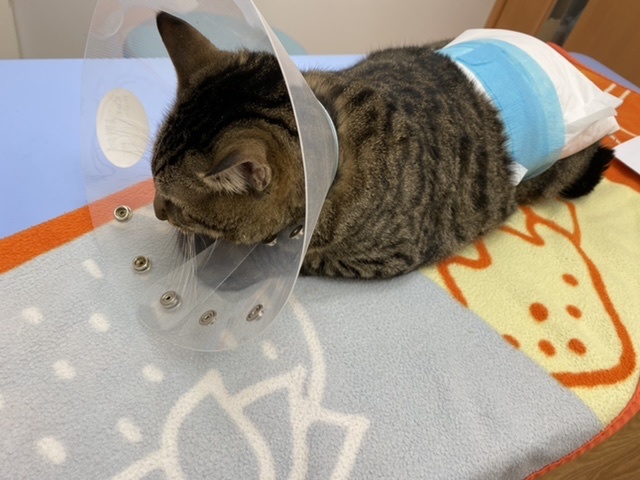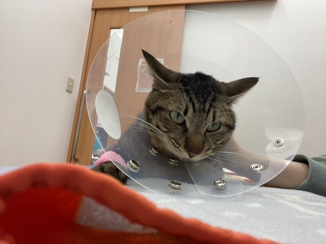 ↑面会に行くと、尿カテーテルと点滴が外れていました。前日とは違い、診察台から自ら私の膝に乗ってきて、甘える姿が見られ安心しました。