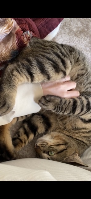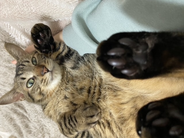 ↑お腹を撫でたりするといつも両手足を、飼い主の手に絡みつけてきます。毎回、お腹を撫でて欲しくて、お腹を見せてきます。