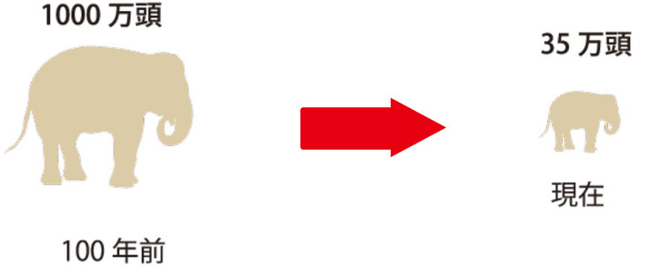 100年前アフリカ象は約1000万頭生息していたと考えられています。たった100年の間に現在はわずか約35万頭にも減少しています。現在もアフリカ象の総数は減り続けています。