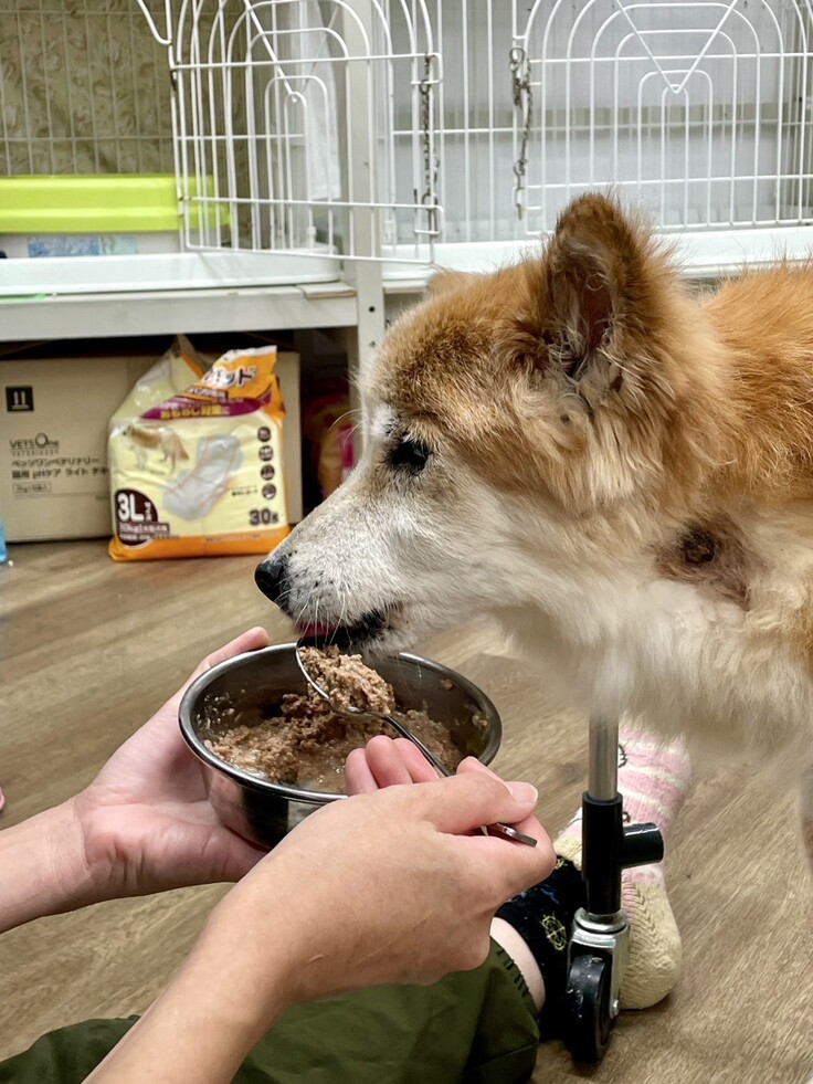 手厚い介護を受けながら、ここでも食欲は旺盛な様子😋