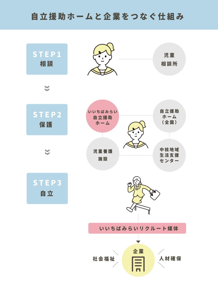 「いいちばみらい」は、現在不足している受け入れ窓口として、さまざまな困難を抱える子どもたちの力になり、安心して社会に出る道を作るための第一歩として、船橋市内に「自立援助ホーム」を開設します。