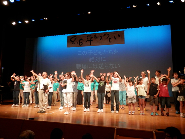 それぞれのグループの「思い」や「テーマ」から曲を選び、ホールに平和の歌声を響かせています。この集会の「しめくくり」は「ヒロシマの有る国で」の全員合唱です。子どもから大人まで各グループの演出を楽しみながら平和について考えることのできる集会をめざしています。