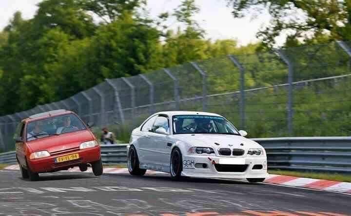 なんだか車種はわからんが、小兵がBMWに果敢に挑もうなど、ノルドシュライフェは下剋上ですね。しかもノーヘル。難所プラッツガルテンでジャンプ、着地とともに右旋回だけど、その前にもう姿勢が……。着地後に無事に曲がり終えたとは到底思えないのだが……。💦