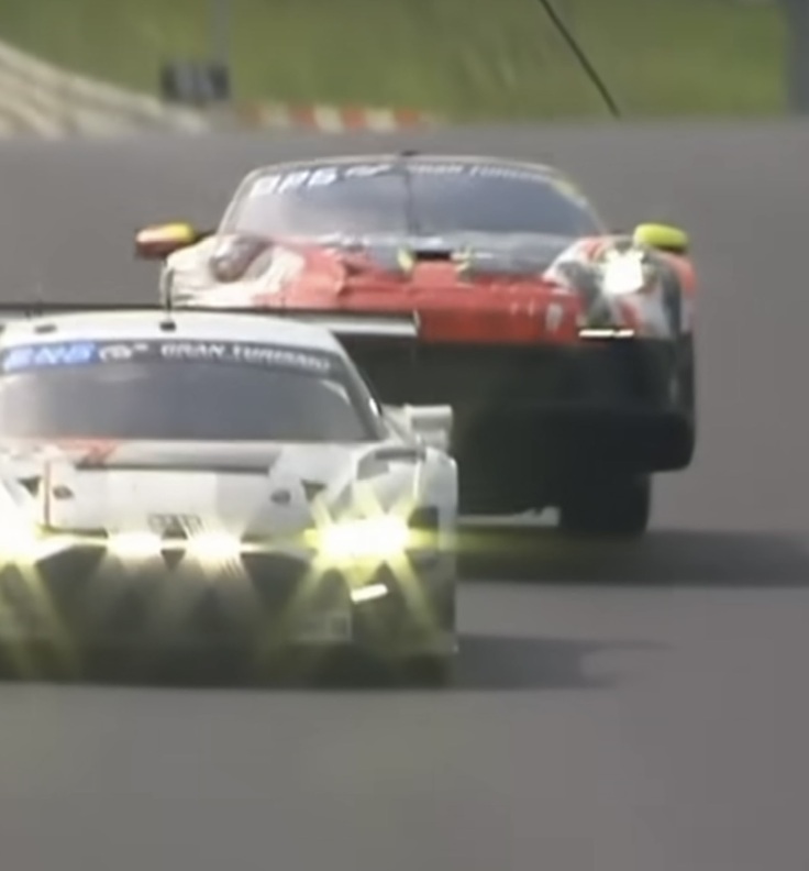 フルグプラッツまでスリップ使ってくるとね、ダウンフォースが不足することがある。なので、ジャンプする瞬間にパワーを絞って、ノーズを下げ気味に飛ばないとね、追突もしていないのにこうなる。サーキットなのにバク転の名所って、ニュルブルクリンクだけじゃないかなぁwww😆