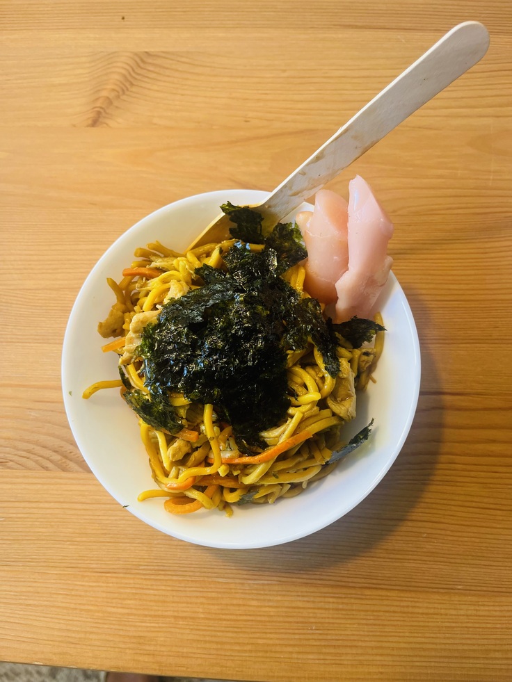 【タイ風焼きそば】蒸し麺、ニンジン、長ネギ、鶏肉、醤油、韓国海苔、新生姜、胡麻油、胡椒🤪
