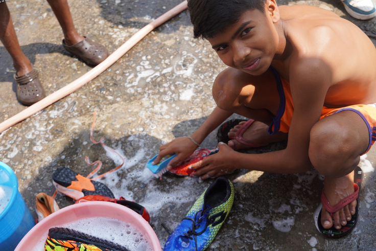 (現在10足の子ども100人近い子どもで使いまわしています。写真は定期的な靴磨きの様子です。)
