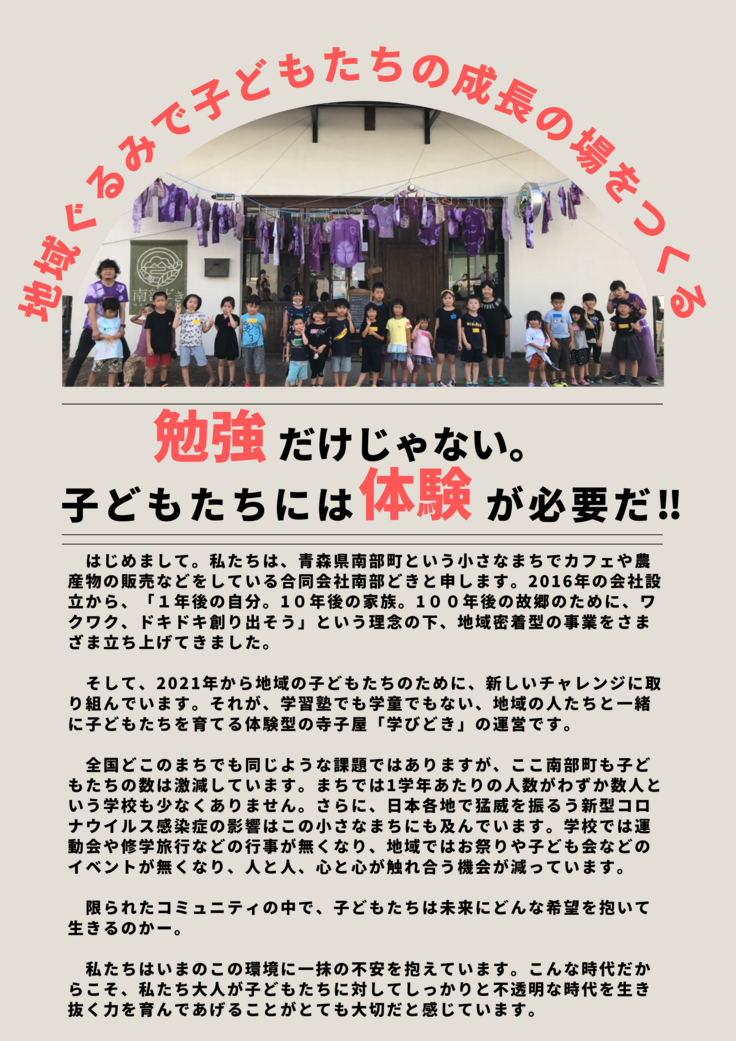 私たちは、青森県南部町という小さなまちで、子どもたちに学びの経験を積ませたいと考えています。地域で支え、子どもたちの成長を見守る場所。そんな場所をつくります。子どもたちの目の輝きがいつまでも色褪せないよう、次代につなげ、ともに成長していく場所をつくります。その場所こそが「学びどき」でありたいと考えています。