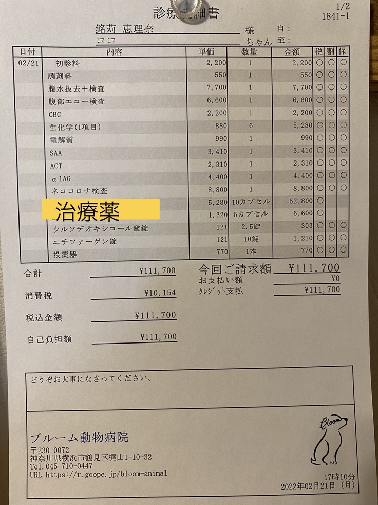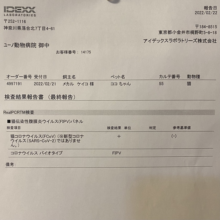 そんな矢先、2.3日だるそうにしていたココが心配になりかかりつけの病院に行ったところ先生から【FIP/猫伝染性腹膜炎】の可能性がある。