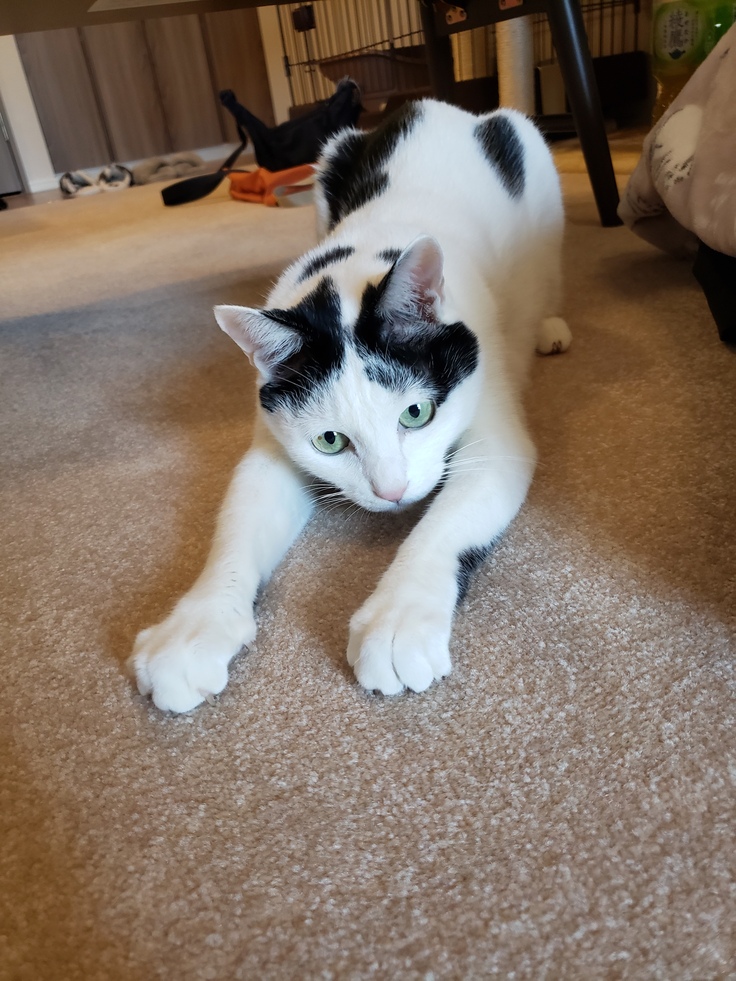 契約訪問で手続き進めていると「ニャオーン」と構ってほしいカウくん。一方サラちゃんは机の下でまったりとお過ごしに。