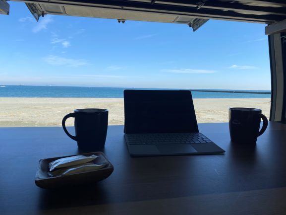 オンライン会議が出来て、コーヒーが飲める書斎のような車。気分転換にいい景色が観られて、ちょっとお昼寝も出来たら…。