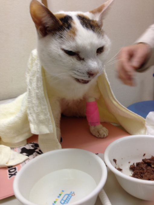 ニャーオと鳴いて、箱座りにはならず立ち上がろうとするので、「入院した時より元気になってるね!」とYさん。