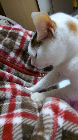 毛布をモミモミ。甘えん坊のチャコちゃんです。